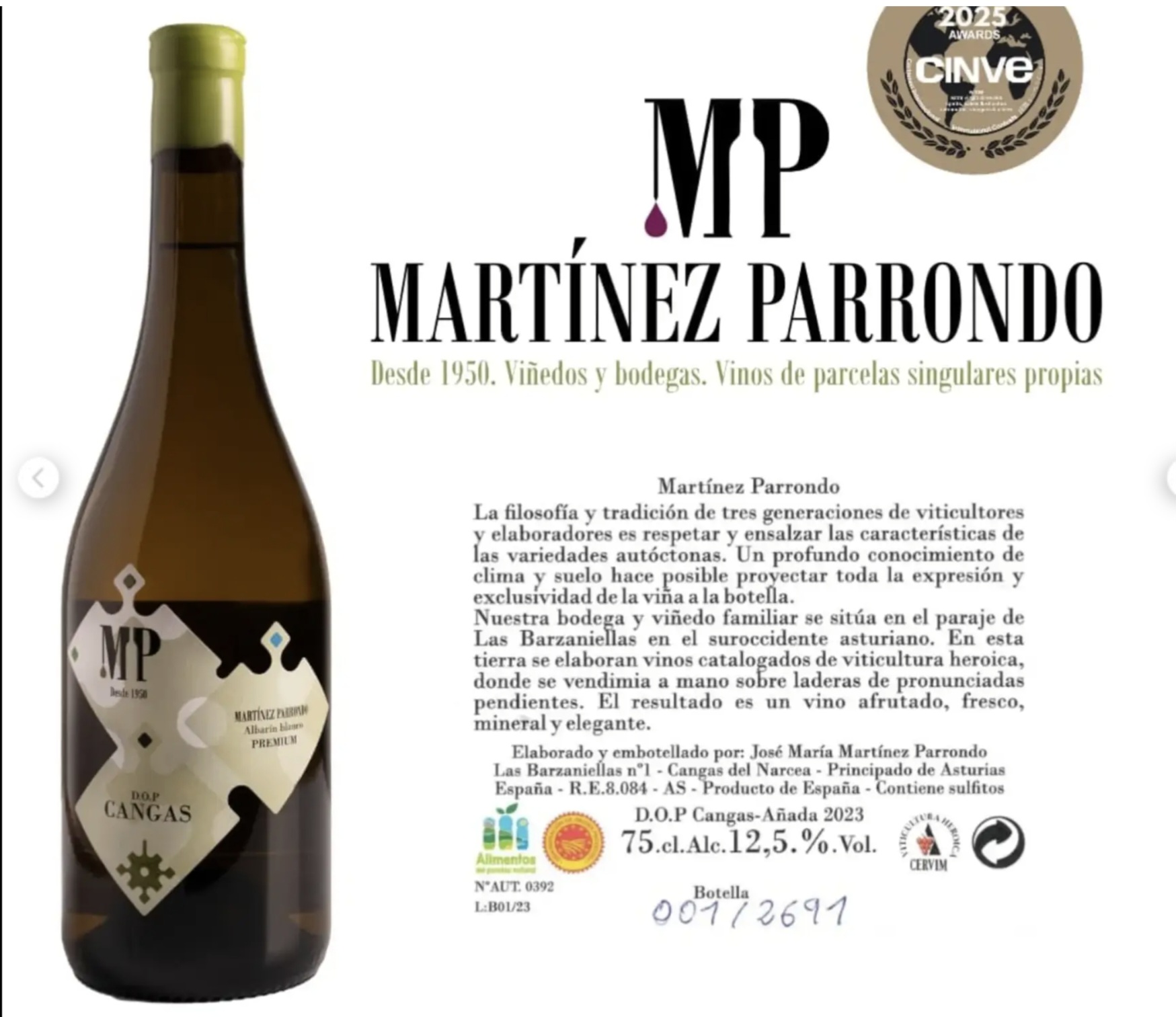 D.O.P. Cangas (Asturias). Variedad autóctona albarán. Vino fresco y equilibrado, con una acidez vivaz y un final elegante y persistente, con trabajo sobre lías lo que lo eleva y lo hace un vino mas gastronómico.